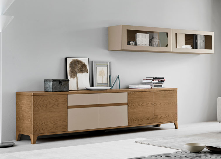 Composition 1 convient à ceux qui recherchent de nouvelles solutions de rangement pour le salon qui allient élégance et modernité, fonctionnalité et recherche du détail, pureté visuelle et harmonie chromatique.