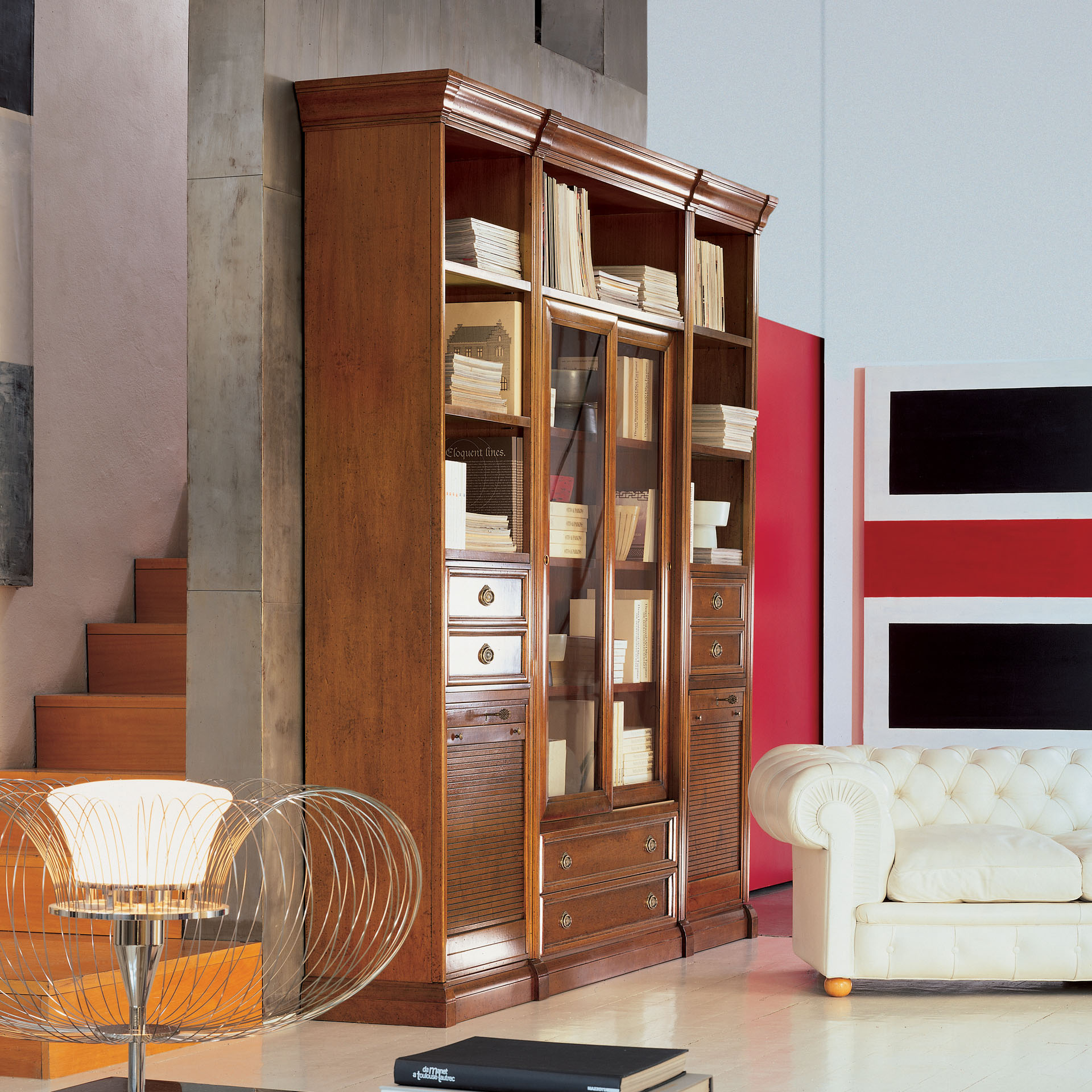 La composition 13, réalisée en petits formats, s’intègre parfaitement dans n’importe quel contexte, devenant un support valable au service de votre salon. Compartiments ouverts, portes à volets roulants et tiroirs définissent et encadrent la composition, qui s’enrichit également d’une vitrine centrale rayonnante. Le système modulaire en bois de tilleul est disponible en deux finitions différentes, classique ou colorée.