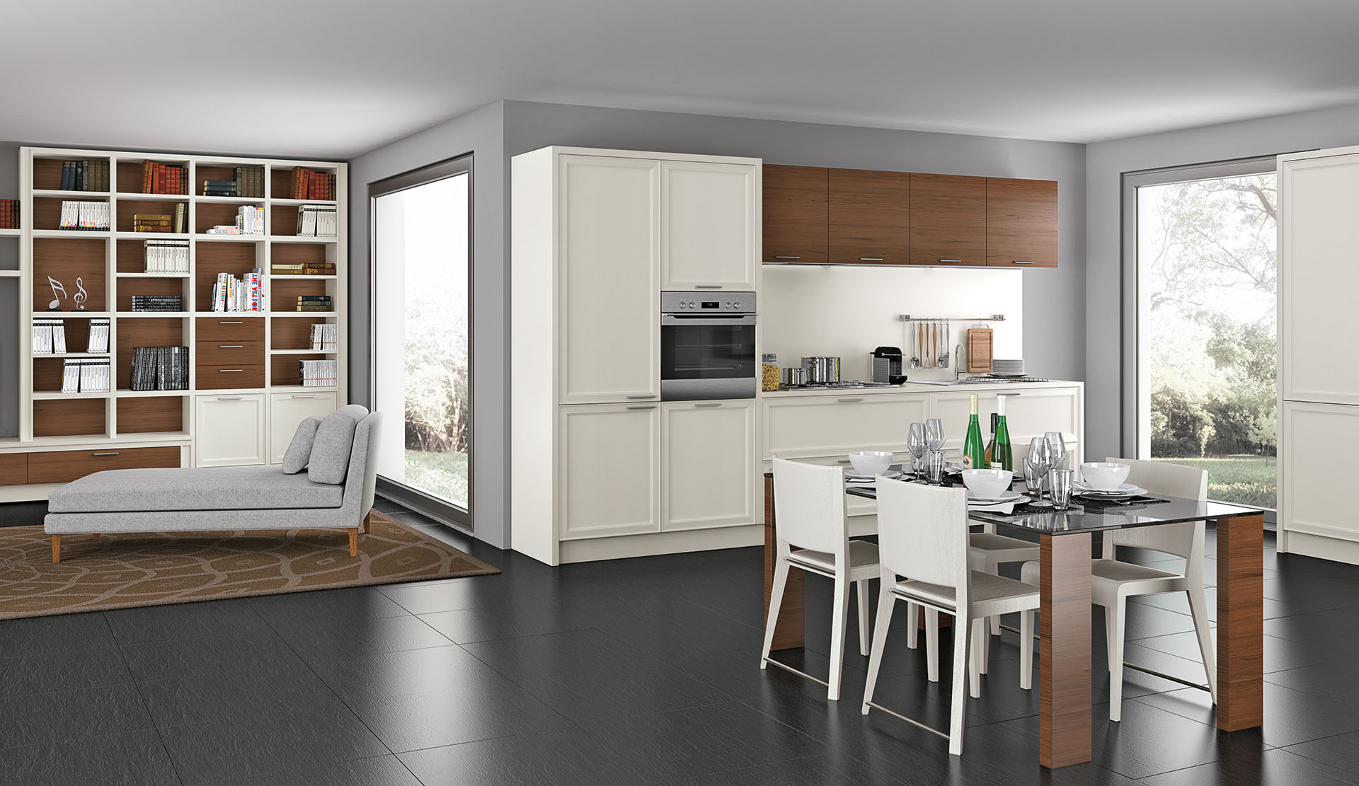 Cuisine en ligne avec les nouveaux besoins contemporains capables de satisfaire au mieux les critères esthétiques et fonctionnels. La cuisine 4, avec sa composition linéaire, est composée de différents éléments tels que des paniers, des éléments hauts et de grandes colonnes et s’intègre parfaitement dans un salon sans frontières, multifonctionnel pour un espace à vivre. La modulation bicolore des finitions définit la ligne de la cuisine, se transformant en un élément caractéristique et décoratif.