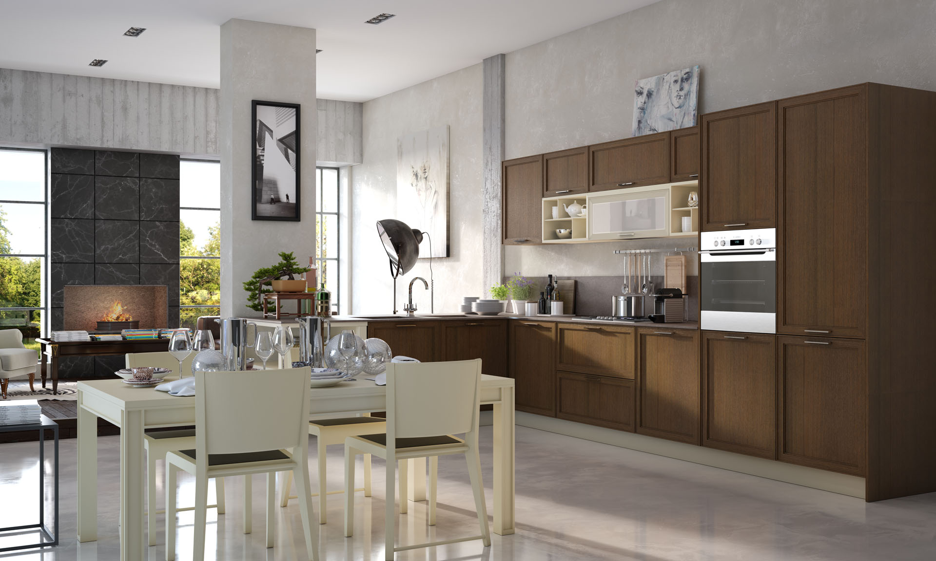 La structure des meubles et des étagères de cette cuisine modulaire est réalisée en panneaux de particules de bois à faible émission de formaldéhyde (classe E 1), anoblis, enduits de résines mélamines résistantes à l’abrasion et faciles à nettoyer. Les portes encadrées sont en bois massif avec le panneau plaqué, peint ou laqué. Les portes à panneaux sont en panneaux lattés plaqués, vernis ou laqués. Les tiroirs et les paniers ont des côtés en métal imprimé et peint ou en bois. Système standard de « frein à la fermeture » sur tous les tiroirs et paniers.