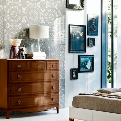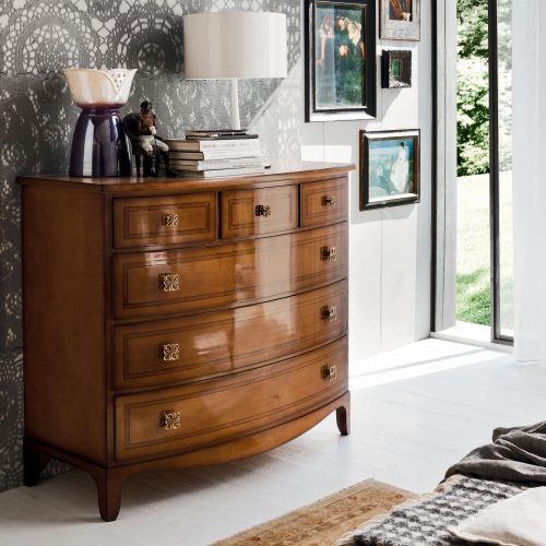 Fiordaliso est une commode à l’image élégante et classique, qui transmet une sensation de chaleur grâce à la structure en bois massif. Le meuble se caractérise par un abattant qui le transforme en bureau et laisse apparaître des tiroirs à bijoux. Les tiroirs sont enrichis de détails soignés tels que les poignées travaillées et les décorations précieuses. Il est possible de le réaliser avec différentes finitions disponibles qui mettent en valeur le meuble classique en en faisant un meuble unique.