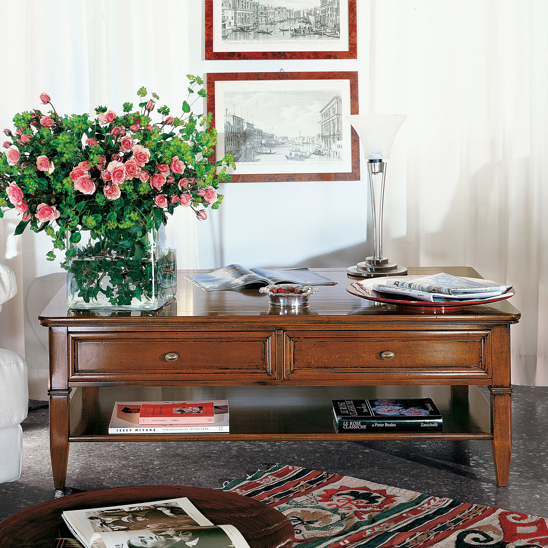 Pas seulement une table basse. Des tiroirs confortables et larges caractérisent l’espace sous le plan, ainsi qu’un grand comptoir pour ranger livres et magazines. La forme rectangulaire avec des détails délicats enrichit la structure.
