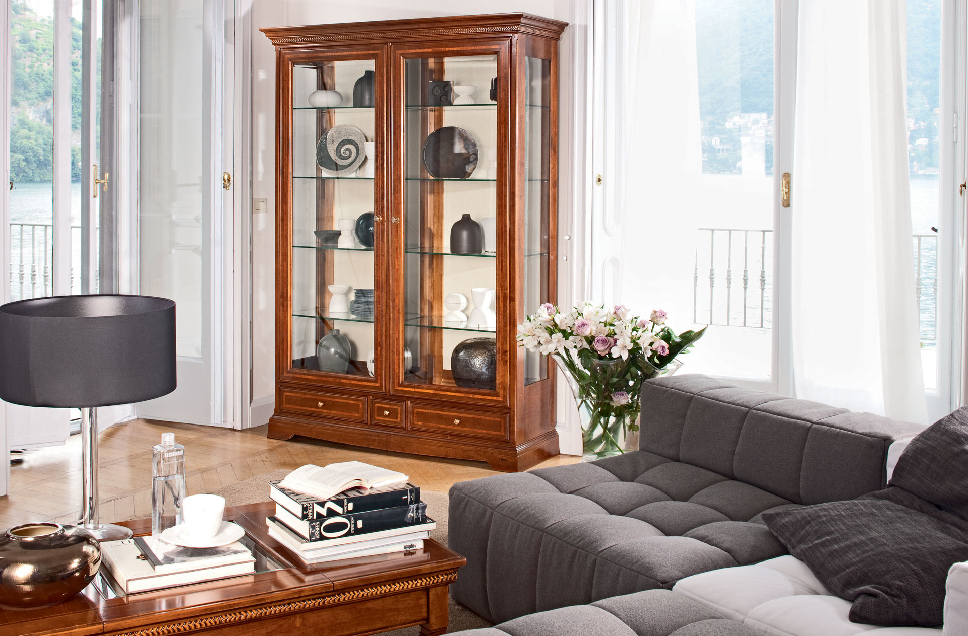 Dal carattere maestoso, l’argentiera è una raffinata mescolanza tra la calda natura del legno e la leggerezza del cristallo, delicatamente rifiniti da intarsi e decori che avvolgono il perimetro del mobile. Elegante contenitore a servizio della zona Living, Ninfea si presenta come un mobile raffinato ricco di dettagli ed elementi luminosi che valorizzano l’artigianalità del prodotto. Il mobile è composto da una struttura sulla quale si inseriscono trasparenti vetrine, due ante in vetro e tre cassetti di differenti misure, utili per custodire oggetti. Ninfea è disponibile in tre diverse finiture che valorizzano e impreziosiscono le forme rendendolo il mobile unico nel suo genere.